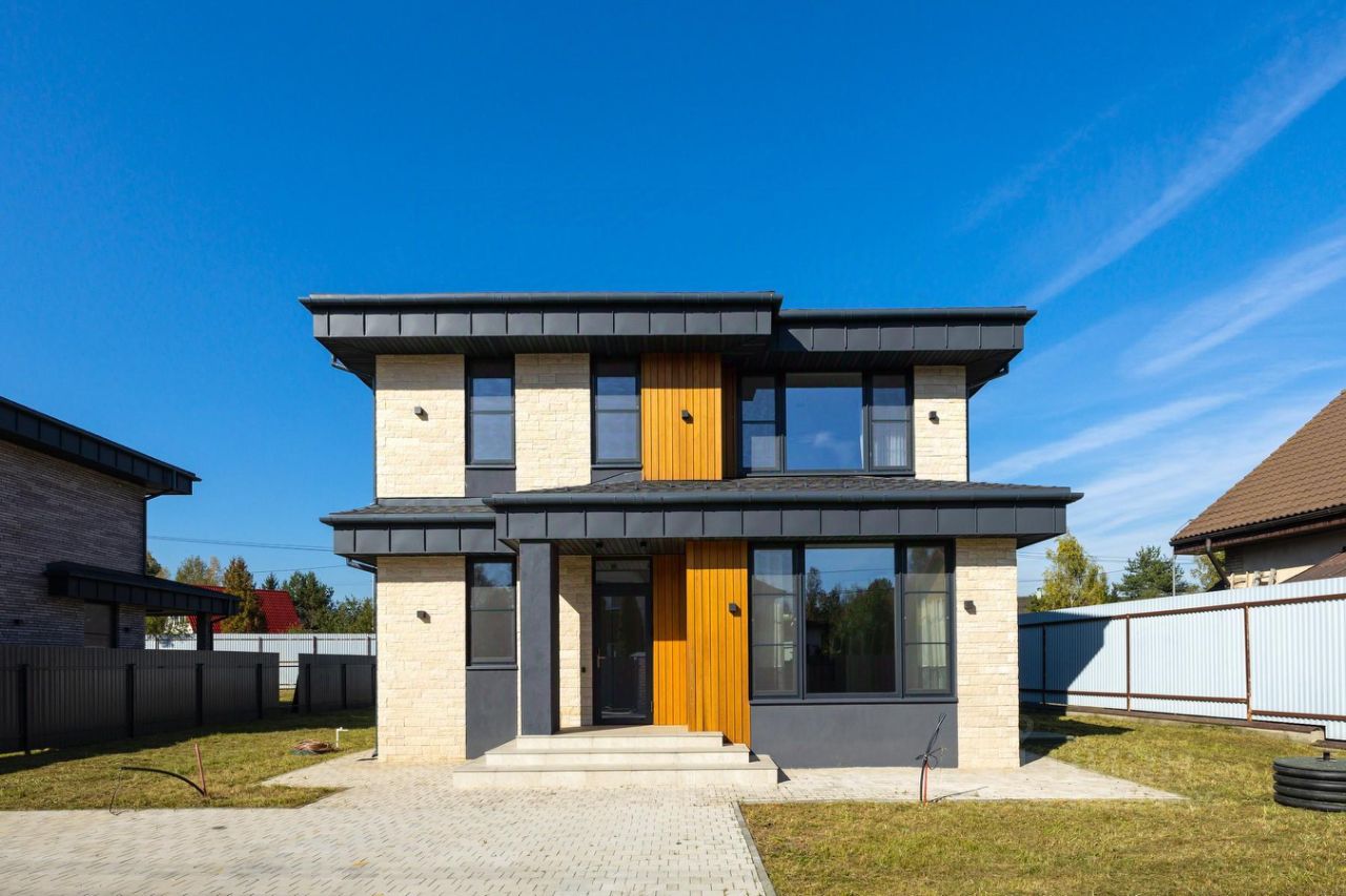 Стены: газобетонный блок (400 мм) Bonolit, фасад плитка из искусственного камня, планкен из натуральной лиственницы.