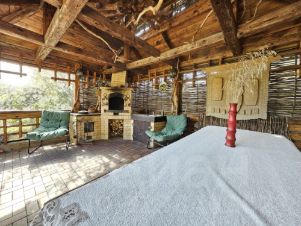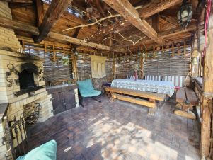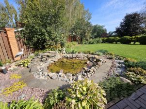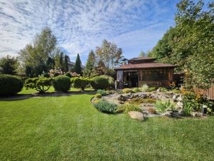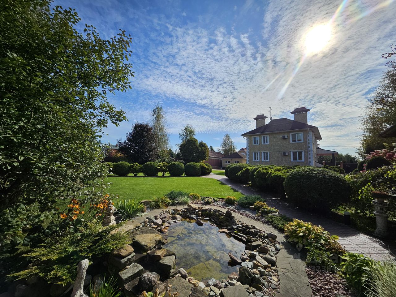 Участок правильной формы, огорожен по периметру, установлены автоматические откатные ворота, вокруг дома выполнена дренажная система. На участке засеян газон, вымощены дорожки (вся тротуарная плитка производства Германия), есть декоративный пруд и шикарная беседка с мангалом и казаном.