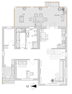 1 этаж прихожая, котельная, гардероб, санузел, спальня-кабинет, кухня-гостиная-столовая (единое открытое пространство) и выход на террасу 30 кв.м.