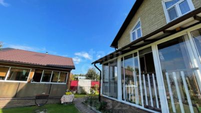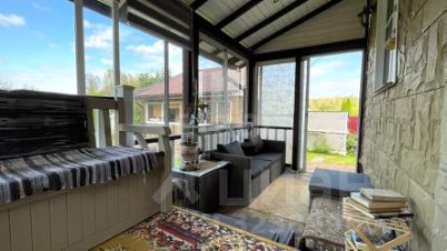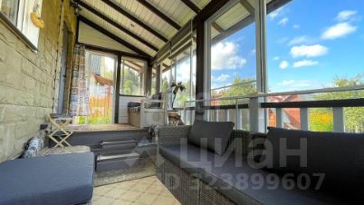 К дому прилегает терраса с панорамным остеклением, раздвижные створки в пол. Терраса уютно укомплектована мебелью.