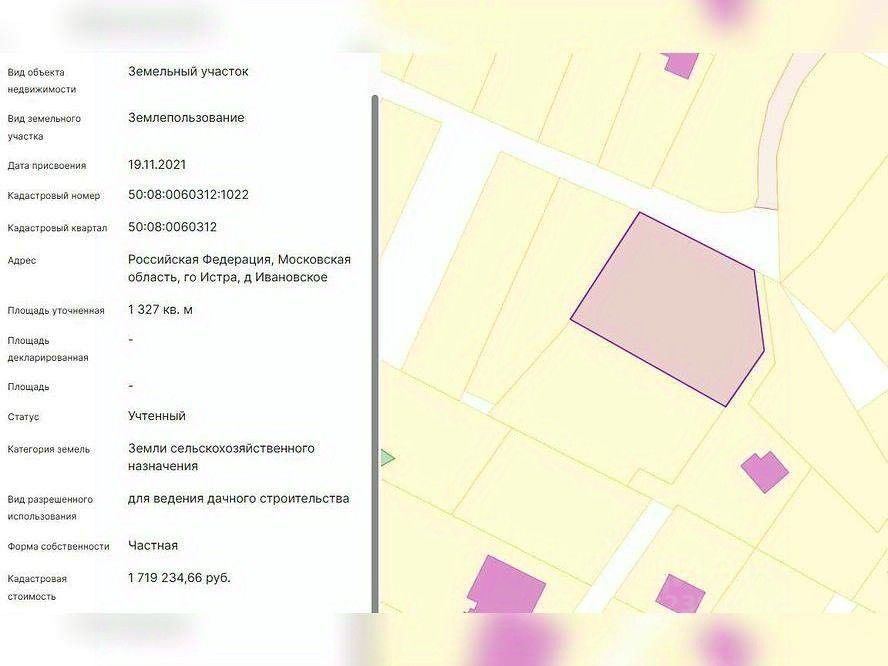 В рамках процедуры банкротства реализуется земельный участок по адресу: Московская область, го Истра, д ИвановскоеКадастровый номер 50: 08: 0060312: 1022Площадь участка 1 327 кв. мКатегория земель Земли сельскохозяйственного назначенияВид разрешенного использования для ведения дачного строительства Координаты 55.86626706, 36.89226028