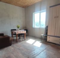 Дом и баню строил собственник . Фундамент ленточный, стены- газоблоки, крыша - кровельный ондулин, окна - двухкамерные стеклопакеты, металлические двери ( два входа в дом). Внешняя обработка стен - фасадная штукатурка "короед", внутри выполнены все работы для дальнейшей чистовой отделки (стяжка пола, оштукатурены стены, помещение разделено на 2 зоны) . На фото 21-22 кухня в доме. Большое пространство позволяет отделить столовую зону с обеденным столом и диванчиком от места для приготовления еды ( газовая плита от баллона, холодильник, кухонная мебель,водопровод ). Есть шкаф для одежды, комод.