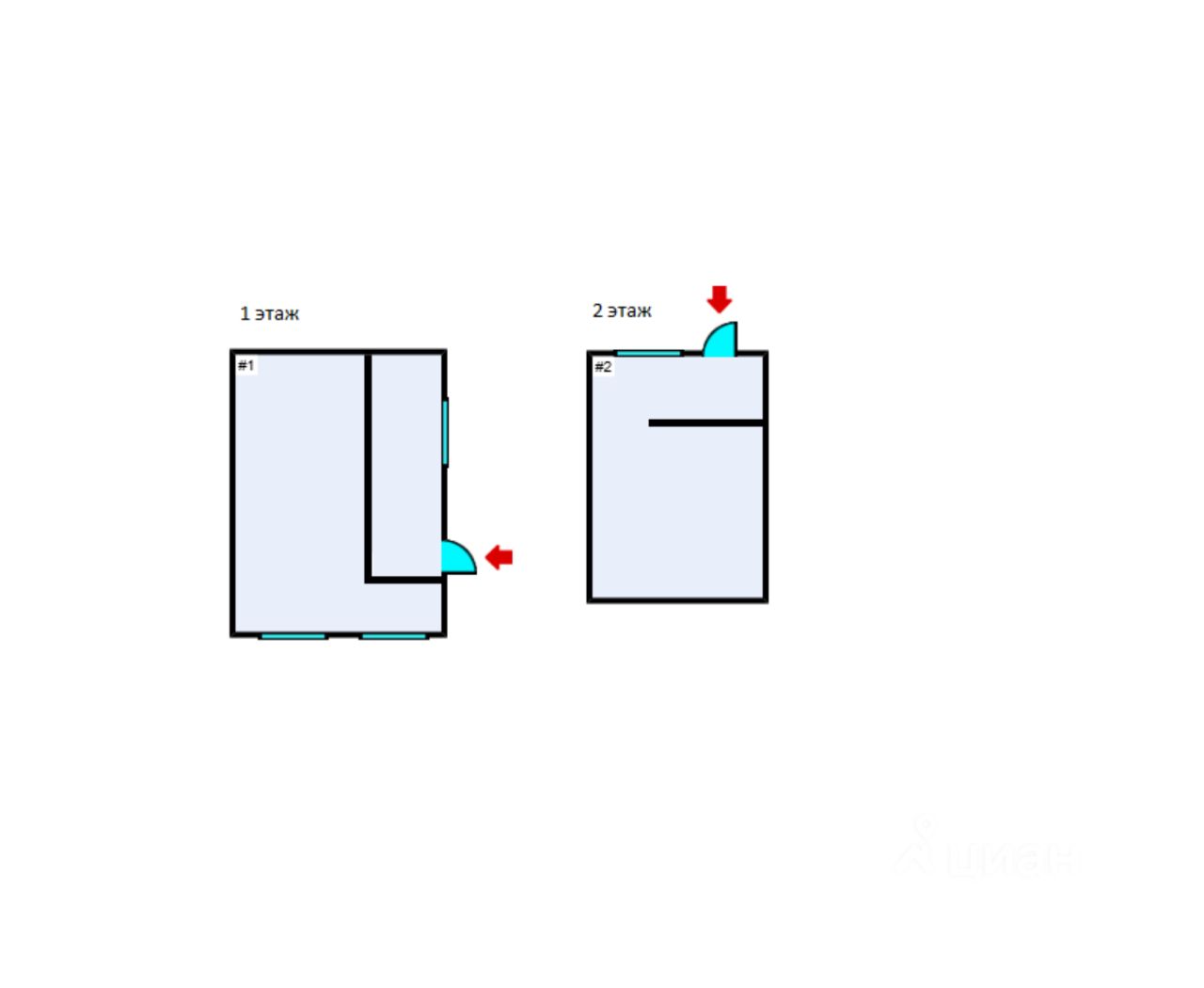 Одна комната на первом этаже и одна на втором