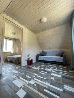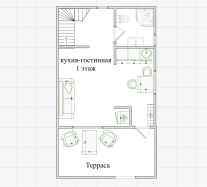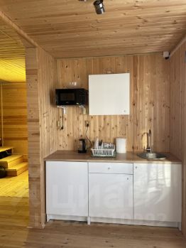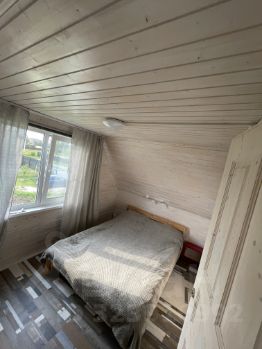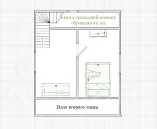 Дом небольшой, но очень уютный. На первом этаже располагается кухня-гостиная и санузел, на втором этаже - изолированная спальня и проходная комната с диваном, окно в которой обращено в сторону леса. Кухня оборудована гарнитуром 180 см, двухкамерным холодильником Bosch, микроволновой печью, индукционной плиткой с одной конфоркой.