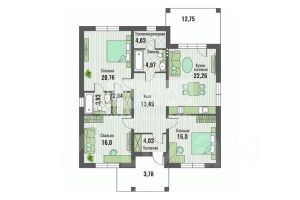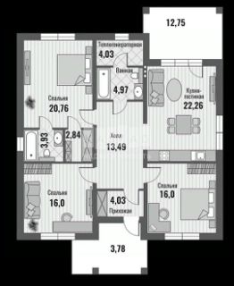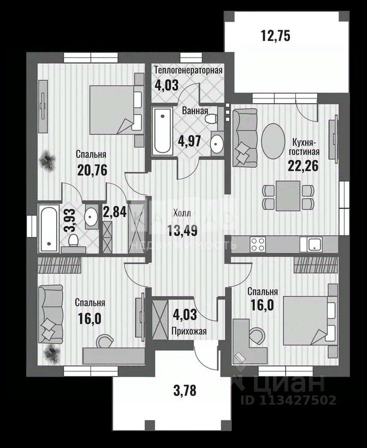 В планировке: кухня-гостиная 22 м² с выходом на террасу, три спальни (в том числе мастер-спальня с гардеробной и санузлом), две ванные комнаты, бойлерная, прихожая и просторный холл. Дом спроектирован так, чтобы каждая комната имела естественное освещение и логичное зонирование.