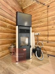 - Обогрев: пеллетный котел-камин с обдувом горячим воздухом, что обеспечивает постоянную сухость и.
