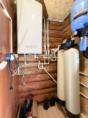 - Водоснабжение: скважина, установлен мощный 63-й насос, с водой нет проблем круглый год. Вода сдавалась на анализ, все в норме, дополнительно установлена многоступенчатая водоподготовка. Есть продувка системы водоснабжения в доме под компрессор, если оставлять на зиму без использования. Бойлер для горячей воды Aeg. По дому вода разведена трубой пп20, труба горячей воды армирована стекловолокном. Сделан вывод воды на улицу. На кухне трехступенчатый фильтр под раковину. На каждой точке есть слив.