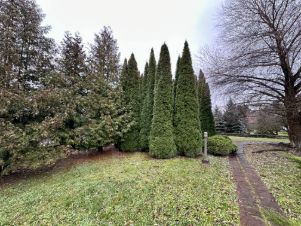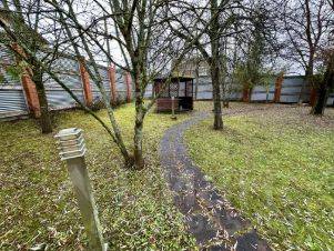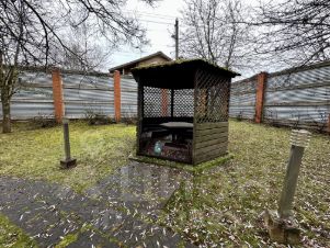 Участок ухожен, посажен газон, кустарники, туи, на участке есть беседка и фонтан ( не работающий), вымощены дорожки для прогулки.