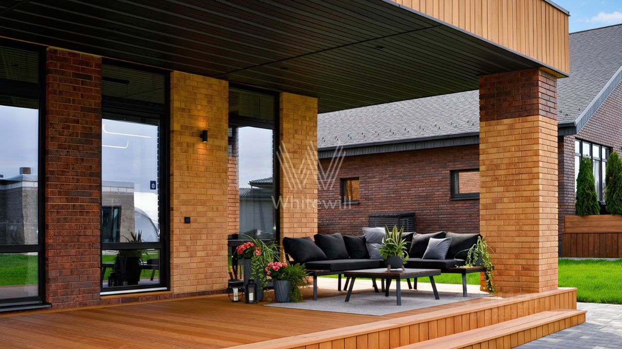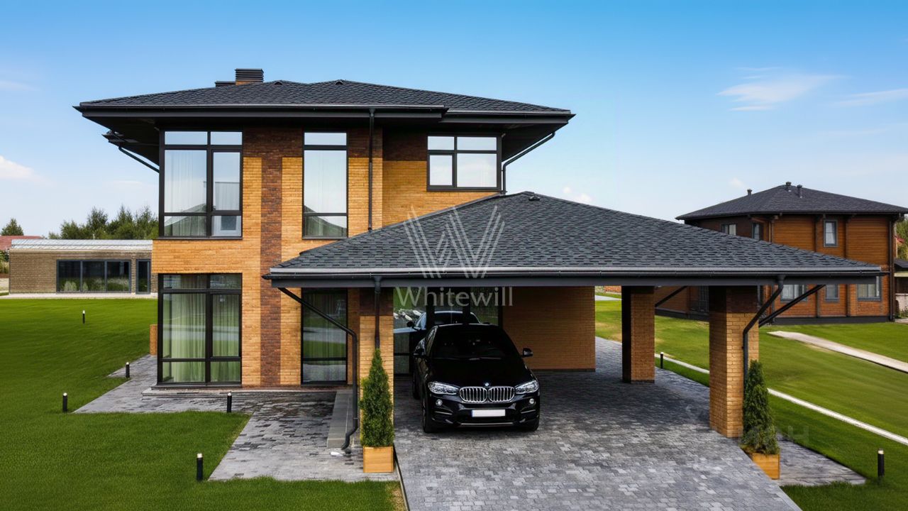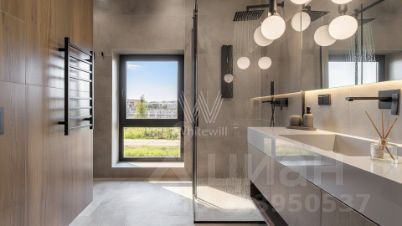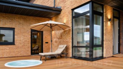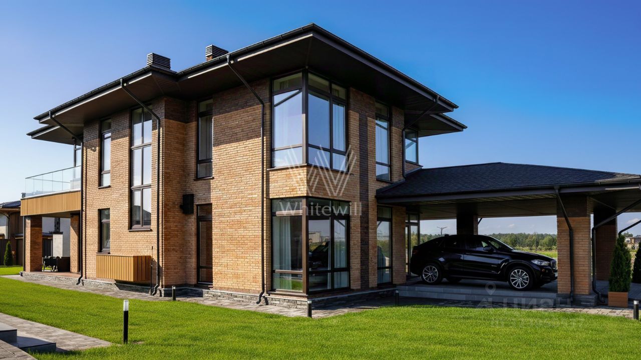 Павловы озёра. Коттедж площадью 354 м² расположен на участке 11 соток и возведён по проекту "Лойд" в стиле Райта. Стены из керамического блока Porotherm облицованы кирпичом тёплого терракотового оттенка, а широкие свесы и панорамные окна придают фасаду лёгкость и открывают виды на природу. Интерьеры выполнены в светлой гамме с применением качественных материалов — дубовая лестница, напольные покрытия из кварцвинила и керамогранита, скрытые двери и потолки с теневым профилем формируют гармоничное пространство.