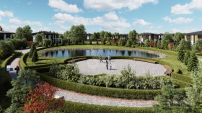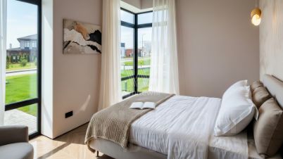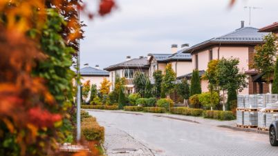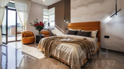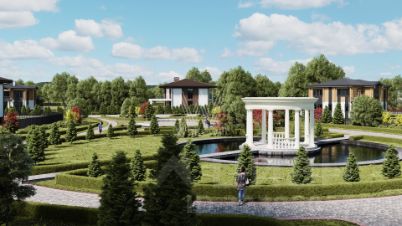 На первом уровне размещены гостиная-кухня-столовая с биокамином, гостевая спальня и спа-зона с сауной, душевой и выходом на террасу с купелью. Второй уровень занимает приватная зона — три спальни с гардеробными и санузлами, две из которых имеют выход на общий балкон. Участок благоустроен газоном, декоративными кустарниками, садовыми дорожками и подсветкой. Для автомобилей обустроен двухместный навес.