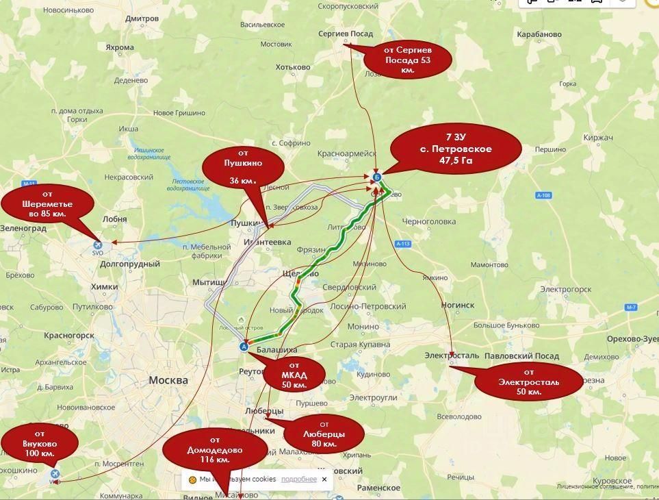 К продаже предлагается массив из 7-ми смежных земельных участков общей площадью 47,5 Га. Участки расположены в Щёлковском районе Московской области, в 50-ти км от МКАД, в северной части с. Петровского. Северная граница участков проходит по лесному массиву, восточная по грунтовой дороге, южная по линии частных домов жителей села Петровское, западная по полю.