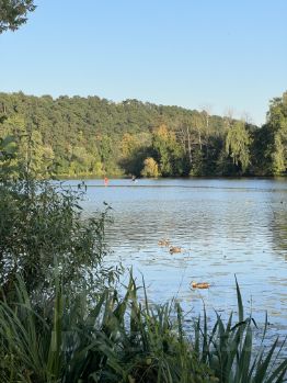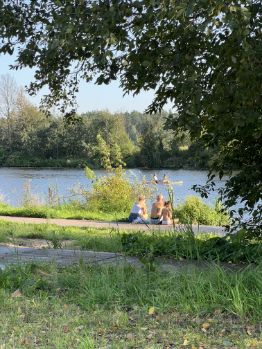 Вдоль реки создана живописная брусчатая набережная со ступеньками, ведущими к пирсам, где можно комфортно расположиться и порыбачить.