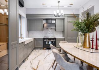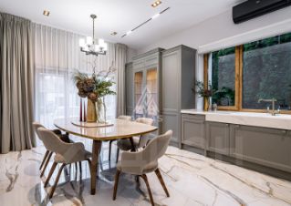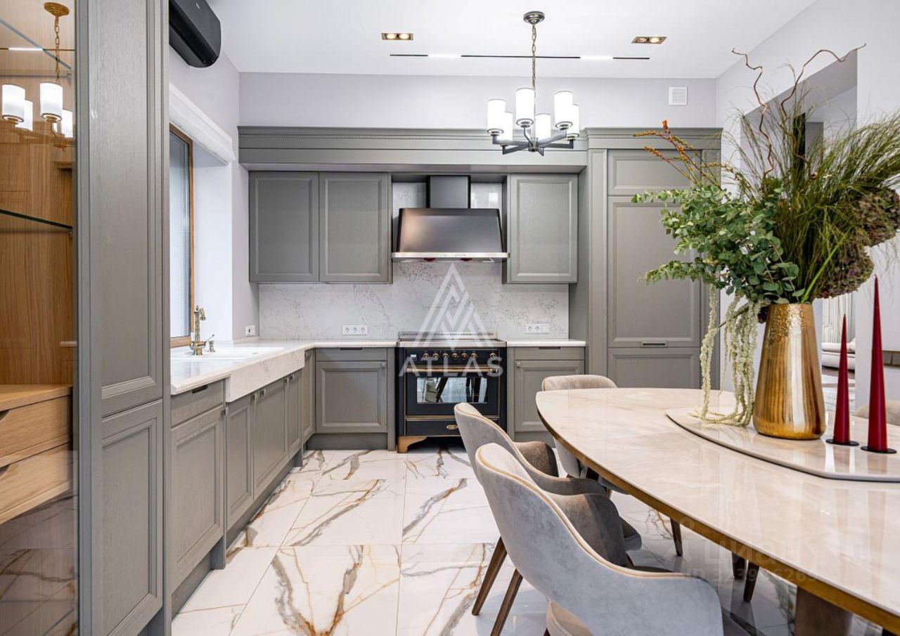 Кухня оформлена в спокойной палитре: каменные поверхности, встроенные системы хранения, обеденная зона с большим столом. Помещение визуально объединяется с гостиной, сохраняя при этом функциональную автономность.