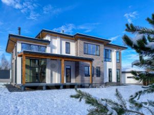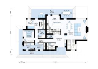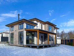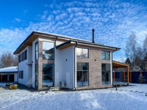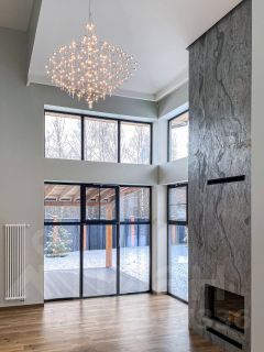 1 этаж: кухня-столовая, гостиная с дровяным камином, большими витражными окнами и выходом на террасу; гостевая спальня, 2 с/у; кабинет; гардеробная, постирочная-бойлерная;