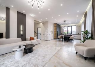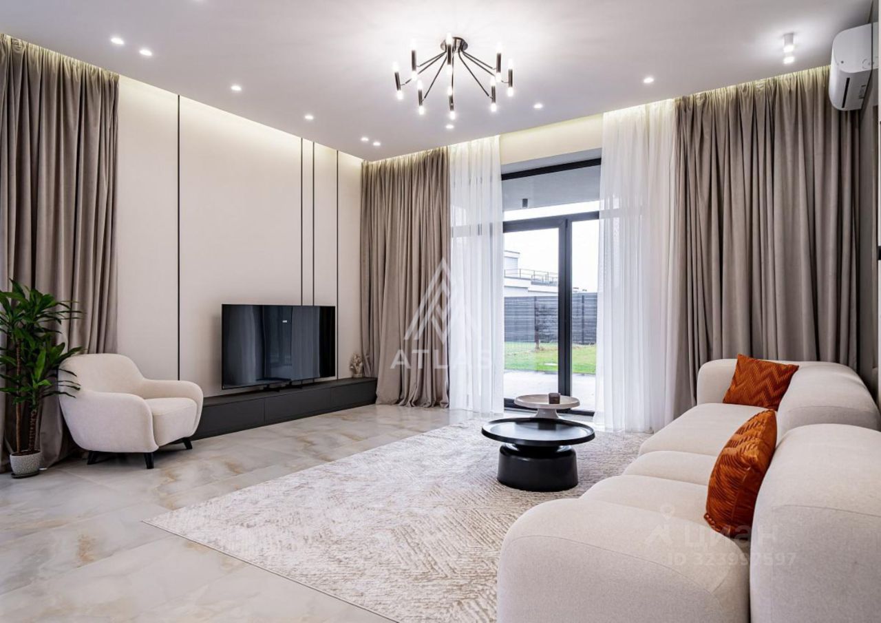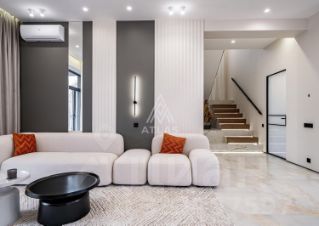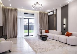 Современная архитектура дома построена на сочетании светлых объёмов и вертикальных деревянных акцентов. Внутри выполнен полноценный дизайнерский ремонт: спокойная палитра, фактурные декоративные панели, мягкие линии мебели, продуманное освещение с акцентными светильниками.