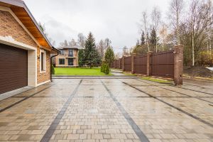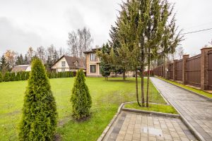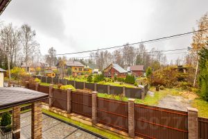 - Забор по всему периметру на свайно-ленточном фундаменте, с кирпичными колоннами и откатными воротами с приводом ALUTECH 1000кг