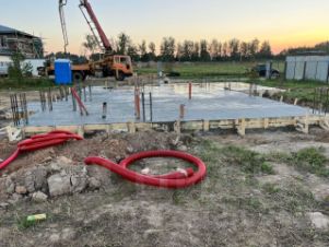 Дом стоит на фундаментной плите 300мм, арматура д20, перекрытия монолитные 200мм. Выполнена утепленная отмостка (50мм утепление, 100мм - бетон с армирующей сеткой).