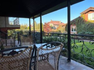 На первом этаже просторная кухня с выходом в сад на просторную крытую террасу. Кухня оснащена всей необходимой техникой.