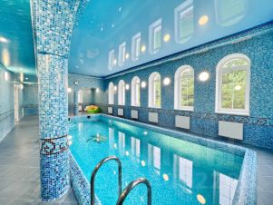 Гостевой дом: 1 этаж: Сам бассейн (10x4 м, глубина 2,5 м), комната отдыха, постирочная, душевая, финская сауна, массажная комната, санузел, вентиляционная комната. 2 этаж: Еще одна уютная зона отдыха (библиотека) и спальня с санузлом.