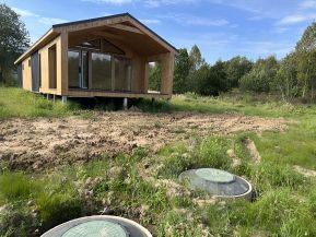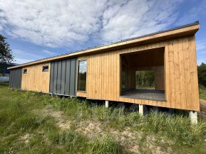Дом построен из экологически чистых материалов, обладает современным дизайном и продуманным внутренним пространством и большими террасами. Просторные комнаты наполнены естественным светом благодаря большим окнам, открывающим виды на природу вокруг.