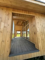 Дом построен из экологически чистых материалов, обладает современным дизайном и продуманным внутренним пространством и большими террасами. Просторные комнаты наполнены естественным светом благодаря большим окнам, открывающим виды на природу вокруг.