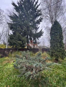 На участке растут яблони, плодовые кустарники и декоративные деревья.
