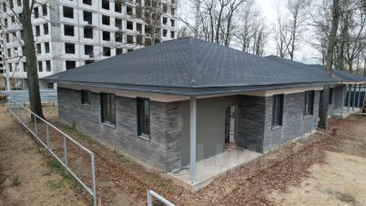 Современный одноэтажный дом из газобетона площадью 194 м² на участке 6 соток. Дом полностью готов снаружи: выполнена качественная внешняя отделка с утеплением, установлены окна, мягкая кровля. Продажа от собственника.