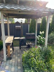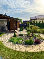 Множество плодовых деревьев, кустарников (смородина, малина, ежевика, паречка), а так же хвойных вечнозеленых насаждений, которые не требуют стрижки и большого ухода (для них проведен авто полив).