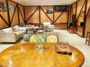 На первом этаже расположены: прихожая, кухня, столовая - гостиная с настоящим дровяным камином (высота потолков более 4 м), кладовая, гараж с прямым выходом в дом, две спальни и выходами на балкон, санузел