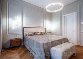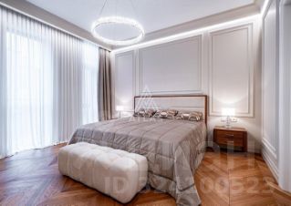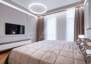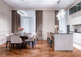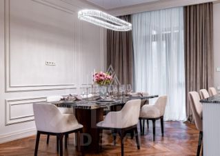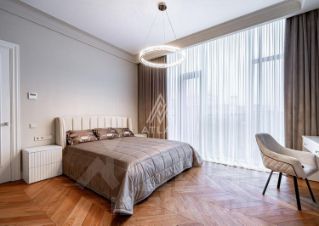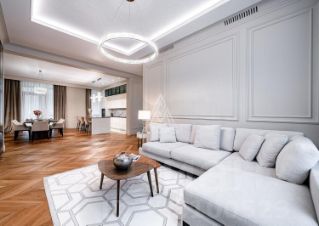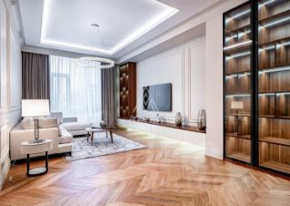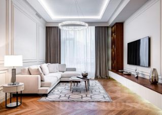 Интерьер выполнен в современной эстетике: светлые стены, изящные молдинги, тёплый деревянный паркет ёлка, мягкие текстуры и лаконичные формы мебели.