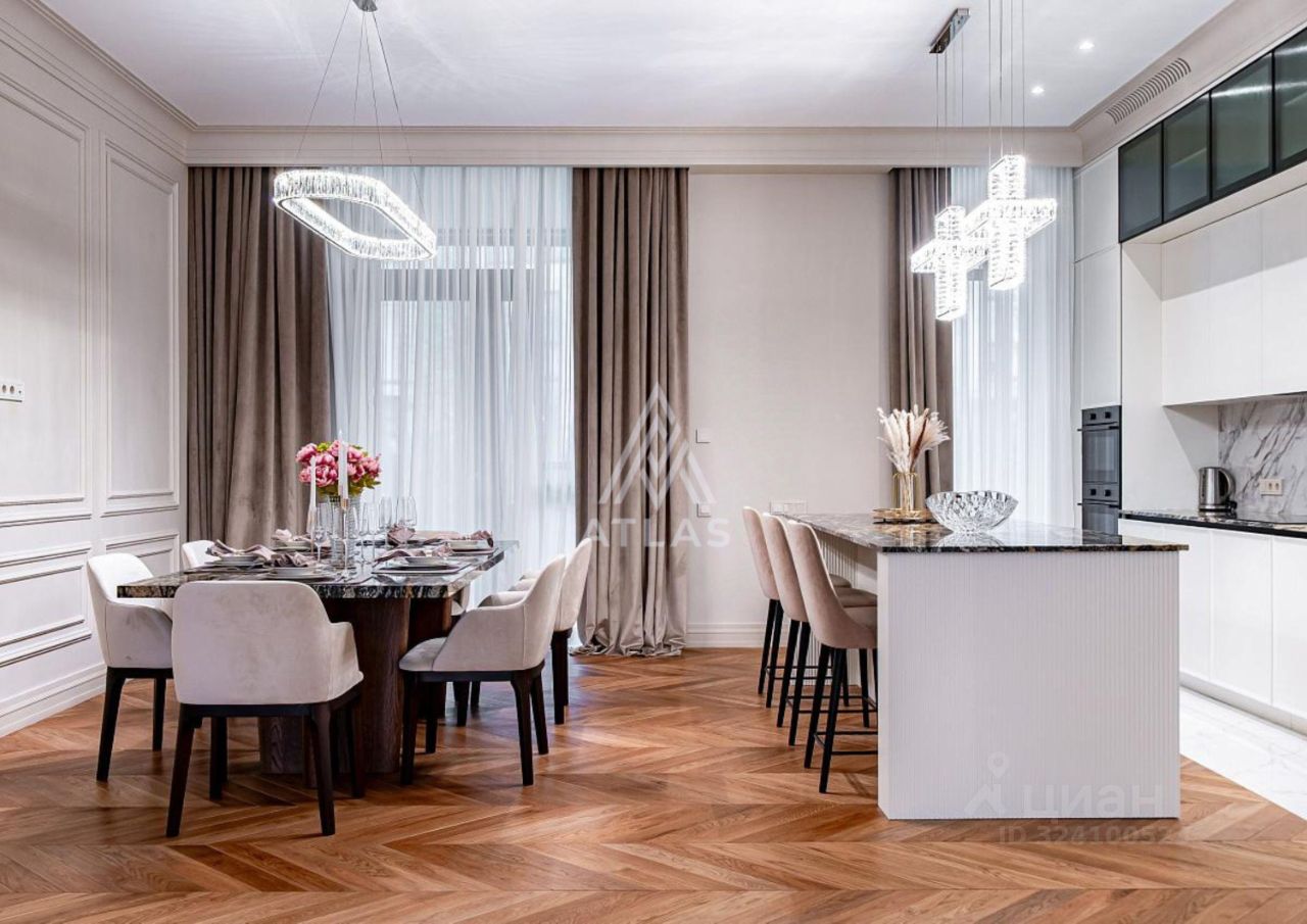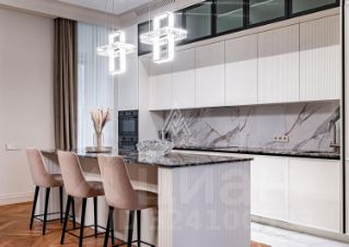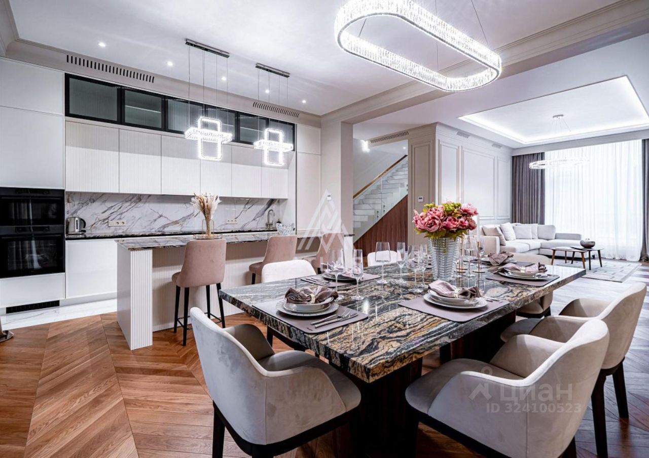 Кухня оформлена в спокойной цветовой гамме, дополнена островом, а столовая и гостиная образуют единый светлый объём.