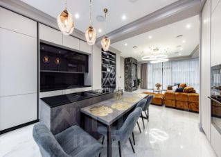 Кухня отличается продуманной эргономикой и современной эстетикой; в отделке использованы качественные материалы.