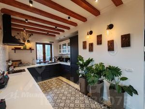 Брус 215*190 мм, Фундамент - монолитная плита, Крыша натуральная черепица Braas, панорамные окна и второй свет, терраса с лаундж зоной и камином. Открытый бассейн с подогревом 5*3 м, зона отдыха, оборудованная шезлонгами.