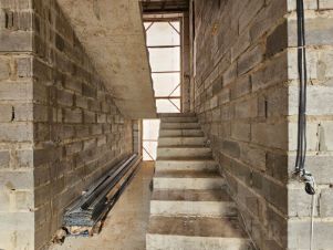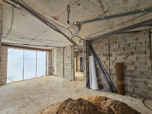 Энергоэффективная каменная кладка: Газосиликатный блок 300 мм. с утеплением фасада. Внутренние перегородки и несущие стены выполнены из пескобетонных блоков.