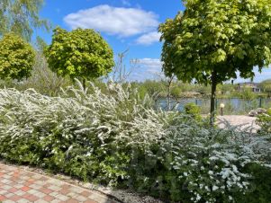 декоративный ландшафт с множеством цветников, декоративным прудом, Альпийскими горками и цветниками. Участок орошается автоматической системой полива.