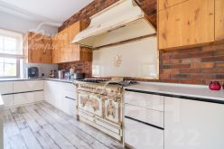 Мебель, оборудование: на кухне гарнитур с островом немецкого производства: верхние фасады из МДФ с дубовым шпоном, нижние крашеный фасады из МДФ, фурнитурой Blum; столешница из кварцевого агломерата (имитация мрамора Calaccata), фартук из клинкерной плитки Feldhaus (Германия), барная стойка из карагача. Встроенная кухонная техника; кухонный блок Restart (Италия) в ретро-стиле с шестикомфорочной газовой плитой с грилем, двумя духовками (большой и маленькой) и вытяжкой; также посудомойка NEFF, холодильник Syde-By-Syde от Restart. В столовой обеденная группа с мощным столом и стульями от фирмы "Эстетика" на 8-10 персон.