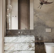 Санузлы оборудованы премиальной сантехникой брендов ТОТО (Япония) и ТЕСЕ (Германия). Раковина изготовлена из высококачественного мрамора Вiаnсо Саrrаrа. Пол, выполнен из турецкого мрамора Fiоr di Воsсо. Сантехническая ниша отделана итальянским мрамором Саlасаttа Сiеlо