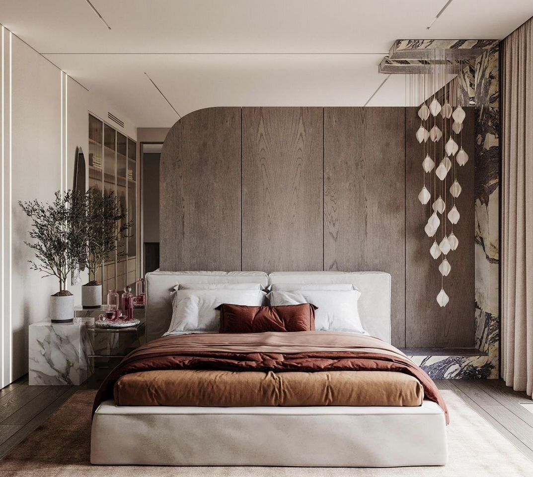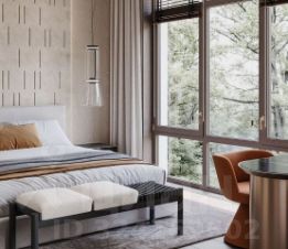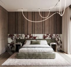 В мастер-спальне паркетная доска Соswiсk из натуральной древесины. Двуспальная кровать от премиального итальянского бренда Ditrе Itаliа оборудована высоким скругленным изголовьем, которое создает эффект камерности. По обеим сторонам от кровати расположены перекликающиеся между собой тумбы и светильники, изготовленные из натурального мрамора. Дизайнерские пуфы от Кеlly Wеаrstlеr становятся ярким акцентом пространства. Напротив кровати расположено настенное панно из белого итальянского мрамора под телевизор.