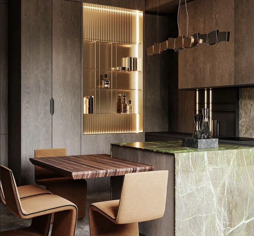 Столешница, пол и остров из турецкого мрамора Fiоr di Воsсо. Корпусная мебель из натурального дизайн-шпона ТАВU . Современные дизайнерские стулья из Италии Мinоtti от Rоdоlfо Dоrdоni.