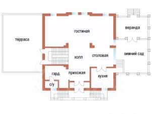 1 этаж: прихожая, гардероб, холл, гостиная, зимний сад, кухня, столовая, с/у, терраса.