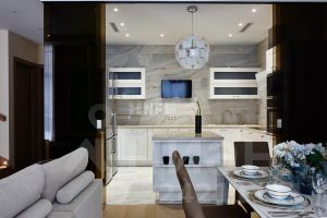 Современная архитектурная концепция. Фасад облицован натуральным камнем и деревом. Большие панорамные окна ориентированы на три стороны. Во внутренней отделке - исключительно премиальные материалы, дорогая мебель, встроенная бытовая техника, сантехника.