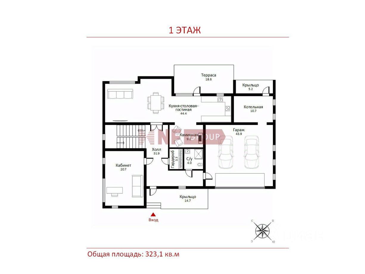 1 этаж: прихожая, гардеробная, санузел, гостевая спальня, кухня столовая гостиная, каменная, гараж, котельная, терраса;
