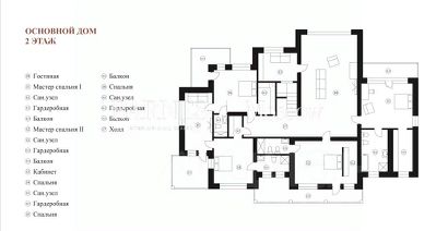 2 этаж: 2 мастер блока: спальня, гардеробная, санузел, балкон; гостиная, кабинет.