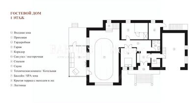 На участке: отдельно стоящий СПА комплекс 250 кв.м. с бассейном, гостевым блоком и блоком для персонала; баня.