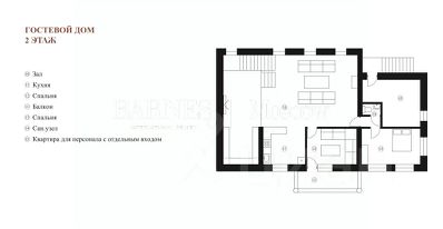 1 этаж: гостиная, кухня, столовая, каминный зал, мастер блок: спальня, гардеробная, санузел; кабинет/спальня с санузлом, техническая комната, 3 террасы.;