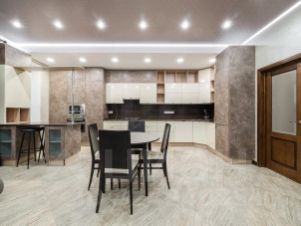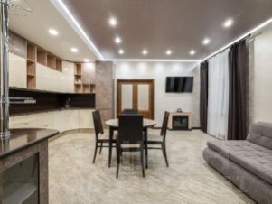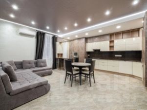 Кухня полностью укомплектована техникой : вытяжка,стиралка, посудомойка, холодильник, духовка, микроволновка. Вся техника встроенная.
