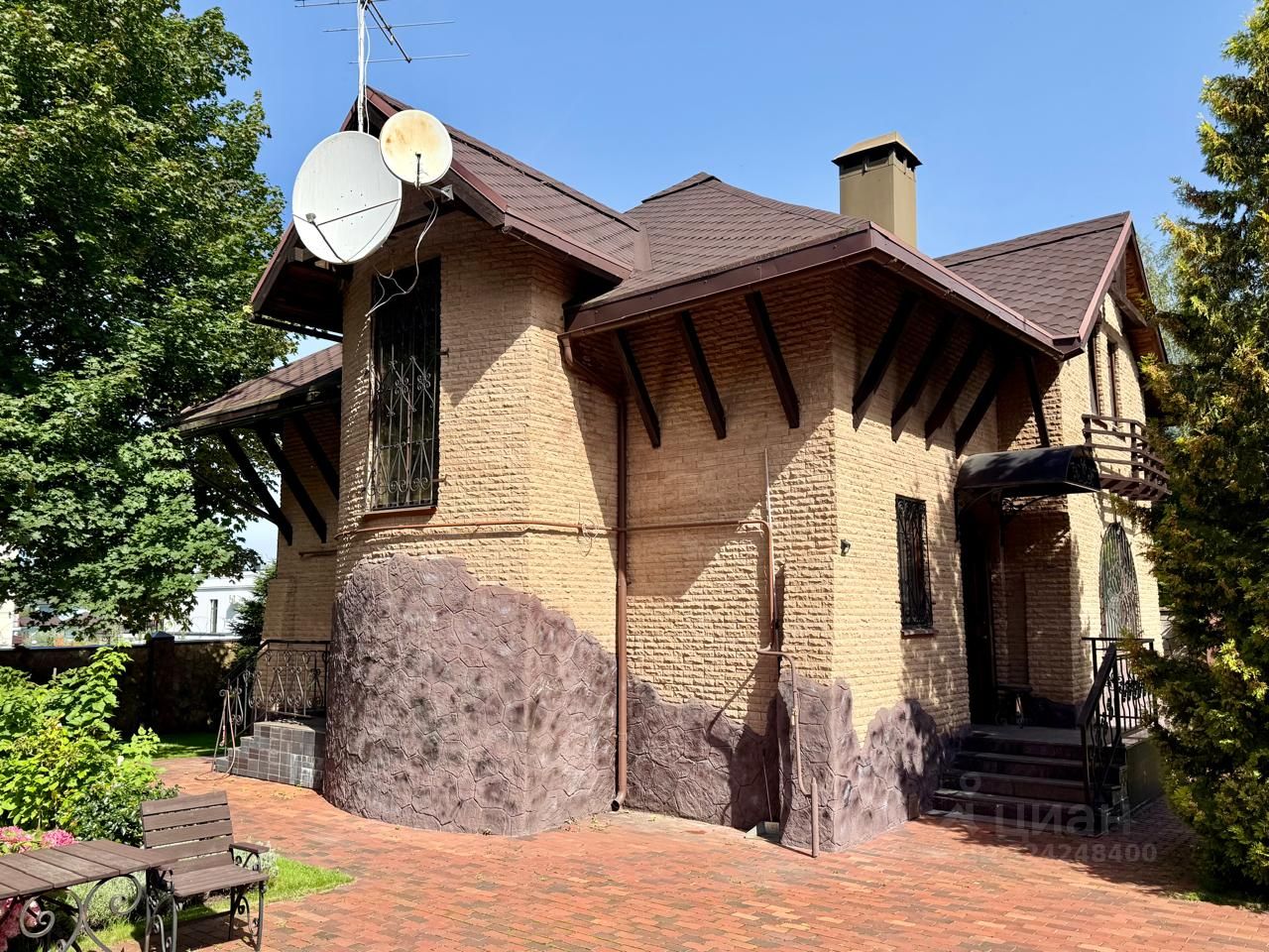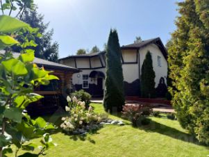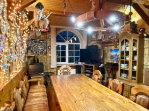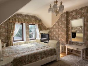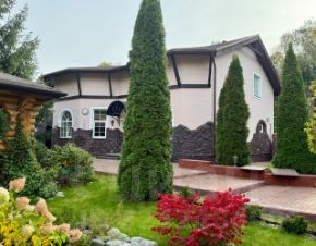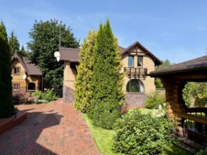 Жилой 2-х этажный кирпичный дом площадью 130 кв. м для постоянного проживания хозяев. Планировка: на 1-м этаже кухня-столовая и гостиная с действующим камином, гардеробная, бойлерная и туалет; на 2-м этаже две спальни, кабинет, санузел с душевой и маленькой ванной.