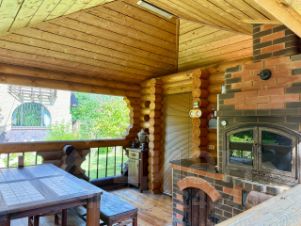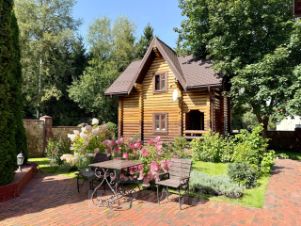 На участке беседка из сруба 6х6 с печью, дровником и кладовой, красивый ландшафт, декоративные насаждения, искусственный прудик.