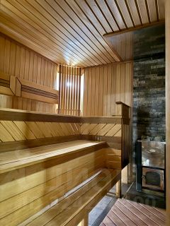Второй 2-х этажный кирпичный дом 200 кв. м с пристроенным гаражом на два авто предназначен для близких, которые не только приезжают к родителям погостить, но и полноценно отдыхают. Планировка: на 1-м этаже столовая, бассейн 3х4, сауна на дровах, раздельный санузел с душевой, бойлерная; на 2-м этаже две спальни и бильярдная.