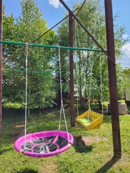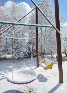 Спортивная площадка (футбол, волейбол) и качели.